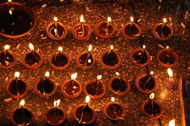 Diwali is a national holiday in India and almost all buildings are illuminated with electric lights or with the more ritualistic earthen lamps. To drive by Indian villages on Diwali is to see entire landscapes of flickering lamps. The festivities begin almost ten days ahead with Dusshera which is followed by Choti Diwali and Badi Diwali – Small and Big Diwali.