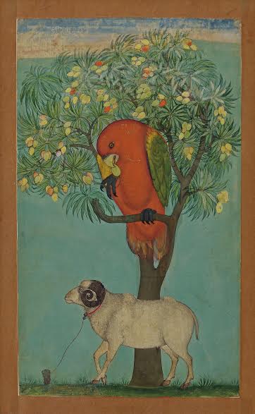 A Parrot Perched on a Mango Tree, a Ram Tethered Below Golconda, ca. 1630–70 Ink, opaque watercolor, and gold on paper 9⅜ × 5½ in. (23.9 × 14.1 cm) Jagdish and Kamla Mittal Museum of Indian Art, Hyderabad (76.438)
