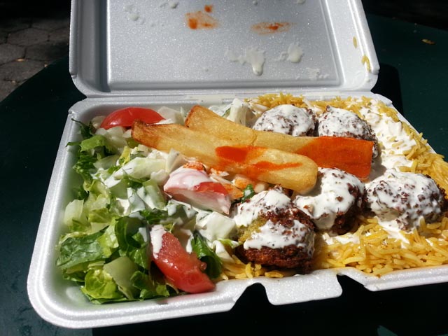 I find myself a nice nook near a water fountain and my box of crunchy falafels over yellow rice with salad, dribbles of white sauce and hot sauce, decorated with four gigantic gorgeously greasy looking French fries. Best lunch I ever had as the high drama of the people show continues all around me. And what a show – the world clad in tee shirts, shorts, mini dresses and sandals, people dribbling ice-cream and soaking sunshine – summer’s last hurrah!