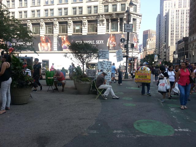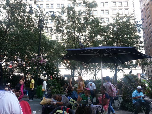 As the last days of summer fade away I did one of my favorite things – buy a street lunch from a vendor’s truck in Herald Square in Manhattan – and eat it while sitting in the public outdoor spaces which have sprung up in busy city areas. It’s hard to believe how these small parks have spruced up life and how easy it is now to catch a few moments of respite from the hurly-burly of Sixth Avenue with its endless crowds, its endless shopping and its endless drama.